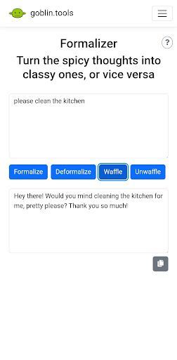 goblin.tools中文版是一款别开脑洞大开的互动游戏,将玩家带入一个充满创意的语气转换挑战世界,真实投入游戏,自由的去投入其中,去体验全新的模拟对话过程。