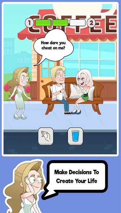 3、看到左右两个图标,点绿色勾手势帮他们和好,或者点蓝色杯子给他们买咖啡和解。