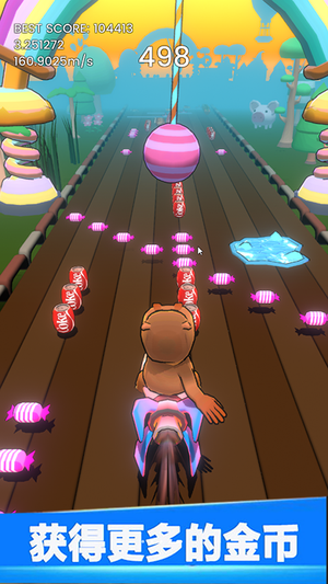 3、拾取沿途金币与道具提升分数与能力,利用特殊路段如弹跳垫、秋千等设施快速穿越危险区域。