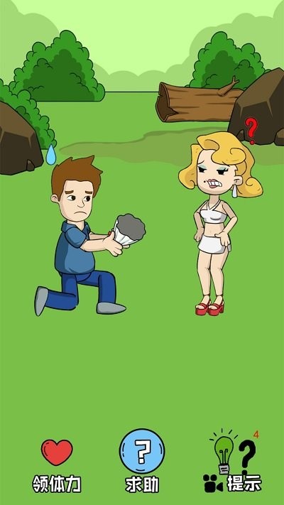 2、瞅关卡1游戏界面,点下方中间带问号的求助按钮,或右侧蓝色提示按钮,获取通关线索。